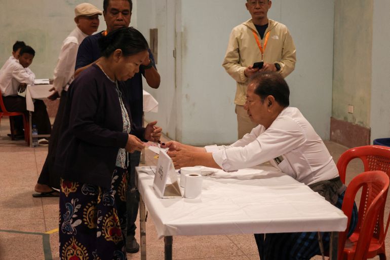 A polling official assists a woman during voting at Kyauktada Township Polling Station Number 1 on December 28, 2025, in Kyauktada, Myanmar [Reuters]