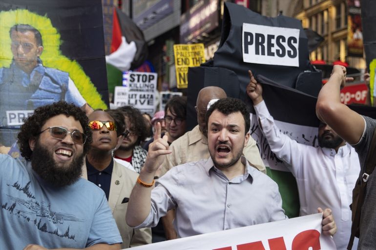 Palestinian activist, Mahmoud Khalil takes part in ‘Stop Starving Gaza’ march in New York to protest the killing of journalists in Palestine by Israeli forces August 16, 2025 [File: Mostafa Bassim/Anadolu]